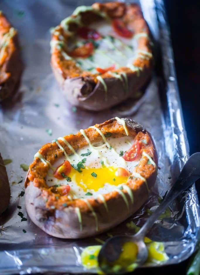 Mexican Stuffed Sweet Potatoes With Eggs Give your Sunday brunch huevos rancheros a run for their money with this healthy upgrade on a Mexican classic. It involves, sweet potatoes, eggs, cilantro, and taco seasoning to get the fiesta started. Get the recipe Per serving: 267 calories, 11 g fat (1 g saturated), 32 g carbs, 105 mg sodium, 0 g sugar, 6 g fiber, 9 g protein Food Faith Fitness