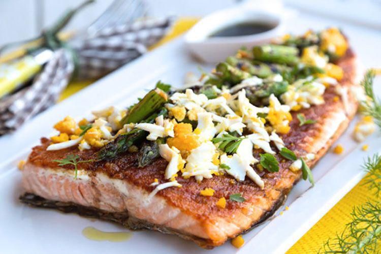 Grilled Salmon And Asparagus With Grated Egg A filet of salmon totally works for breakfast startingnow. Grated egg on top is a genius way of feeling like youre having a shredded mozzarella-topped breakfast while still sticking to the Whole30 plan. Get the recipe Per serving: 246 calories, 14 g fat (2 g saturated), 2 g carbs, 247 mg sodium, 1 g sugar, 1 g fiber, 28 g protein Rowena Dumlao - Giardina