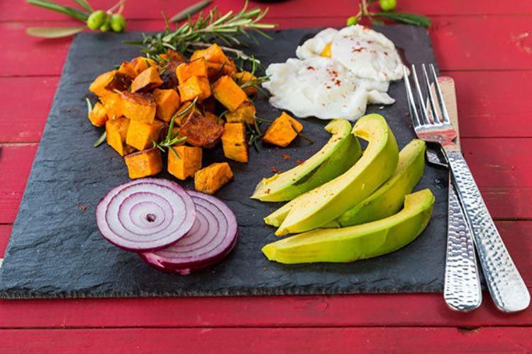 Roasted Sweet Potatoes, Poached Eggs and Avocado Eggs and taters are a hearty breakfast staple no matter how you slice them. Here, let the runny poached egg yolks mix into the baked sweet potato for a heavenly start to your day. Get the recipe Per serving: 262 calories, 19 g fat (4 g saturated), 17 g carbs, 186 mg sodium, 3 g sugar, 6 g fiber, 8 g protein Rowena Dumlao-Giardina