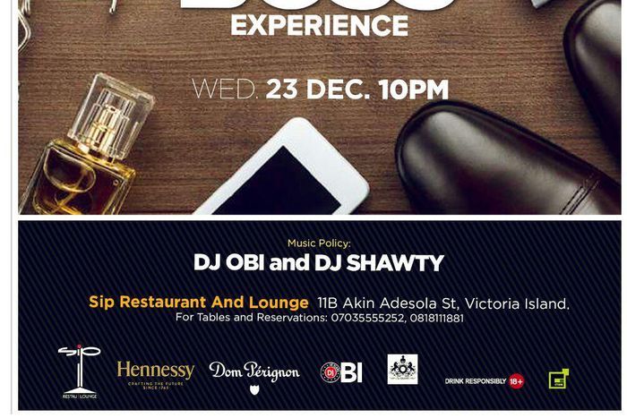 Sip Restaurant and Lounge is set to hold a classy event tagged The Boss Experience. Come and have a Special experience around cognac n champagne as Sip Night Club marks a premium night with Dj Obi and Dj Shawty spinning the wheels of steel all night.