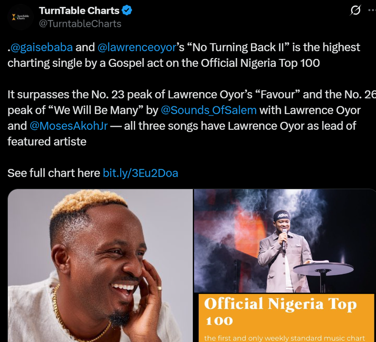 Gaise Baba's 'No Turning Back' becomes highest-charting gospel song in Nigeria