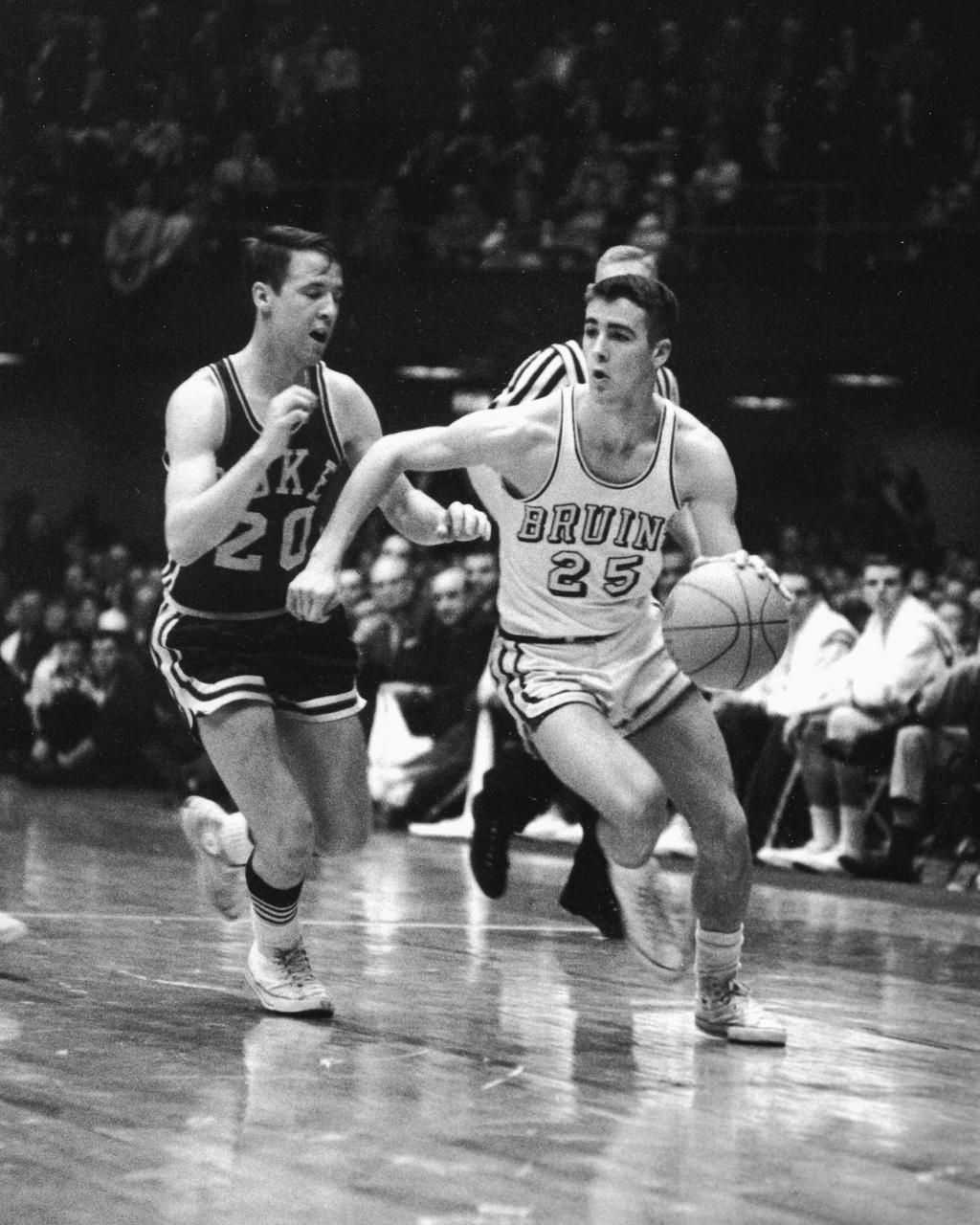 1964: The Bruins Beat Duke University of California Los Angeles guard, Gail Goodrich, takes the ball up court in the championship game against Duke. The Bruins ended up taking home the title this year. NCAA Photos - Getty Images