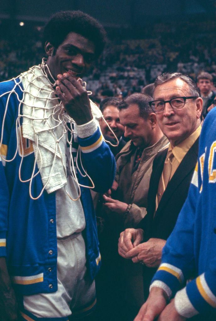 1970: Cutting the Net The head coach of UCLA and Sidney Wicks, seen with the game-winning net around his neck, celebrate their victory. The tradition of NCAA champions cutting down the winning basket's net was said to have originated at the 1947 NCAA Southern Conference by North Carolina State University coach, Everett Case. Rich Clarkson - Getty Images