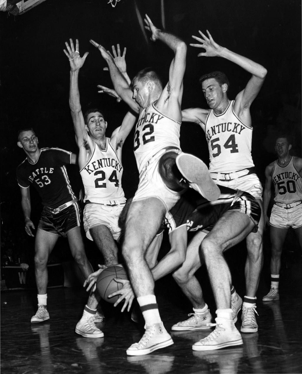 1958: Kentucky vs. Seattle University of Kentucky players attempt to foul Jerry Frizzell on Seattle University's team during the championship game in 1958. Frizzell was later inducted into the Seattle U Athletics Hall of Fame. Sporting News Archive - Getty Images