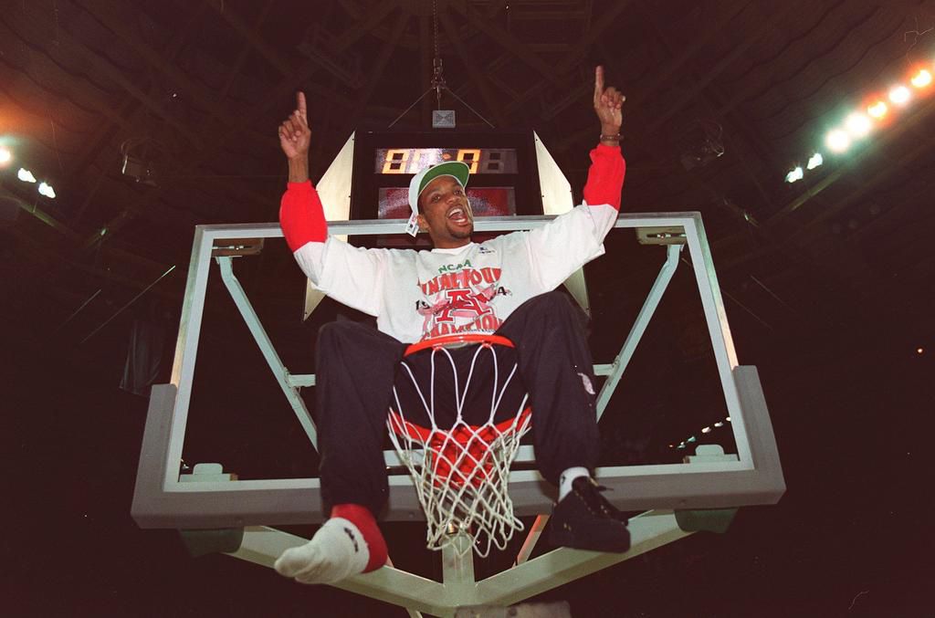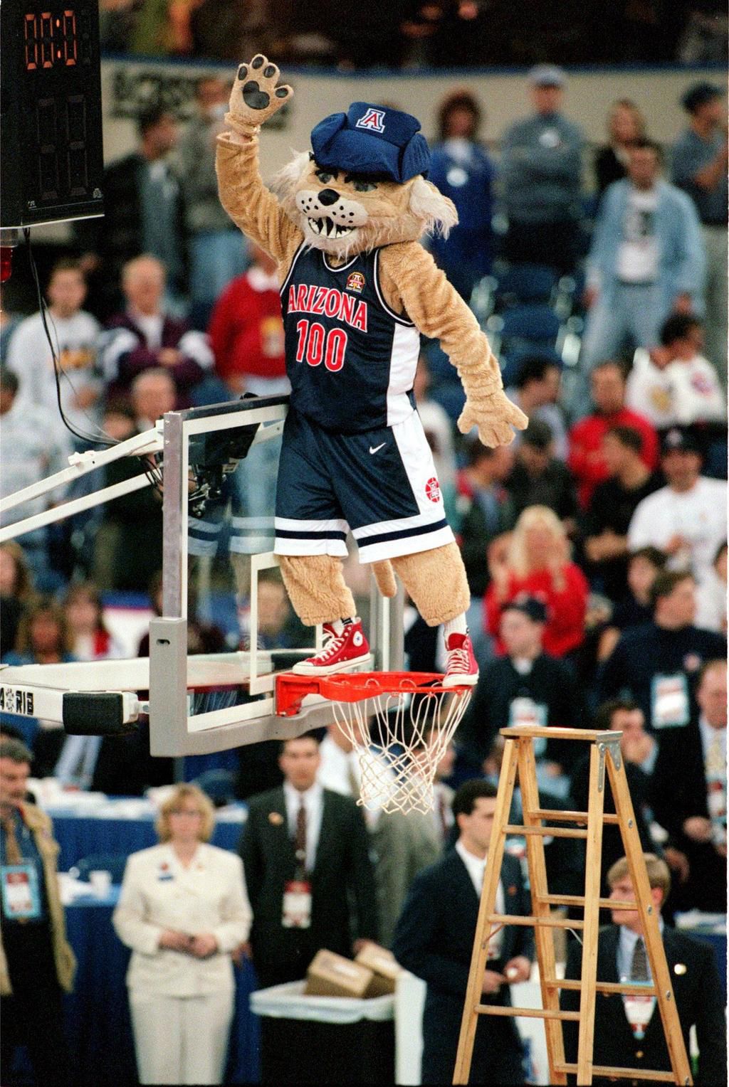 1997: An Arizona Championship The University of Arizona mascot celebrates the team's first NCAA title by climbing onto the winning side's basket in 1997. NCAA Photos - Getty Images