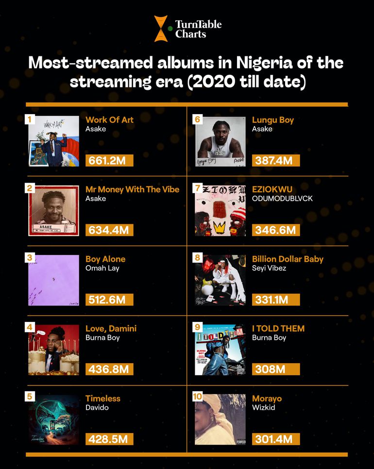 According to data provided by Nigeria's foremost music chart publication, TurnTable Charts, Asake's debut and sophomore albums lead the list of the most-streamed albums in the country since 2020, when digital music consumption became popular.