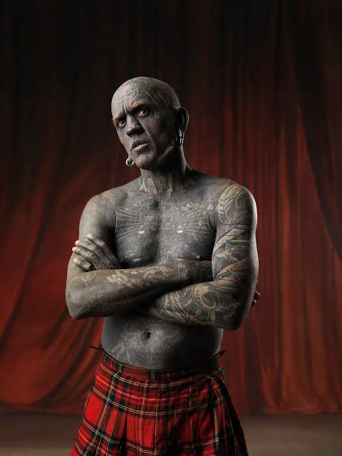 A career in entertainment – As a street performer and entertainer, his tattoos became part of his brand. He performs sword swallowing, juggling, and unicycling, and his tattoos make him instantly recognisable.