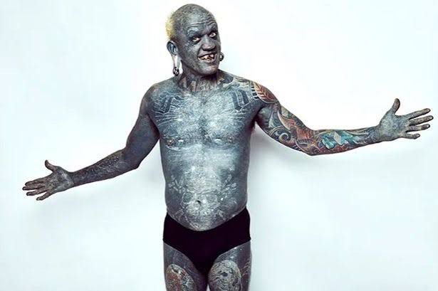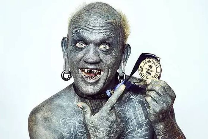 He has spent over 1,000 hours under the tattoo needle, covering 100% of his body—even his eyelids, gums, and private areas!