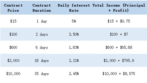 Diverse contract choices: Investors can select from a wide variety of contracts, with daily interest rates and potential returns clearly displayed on the platform.