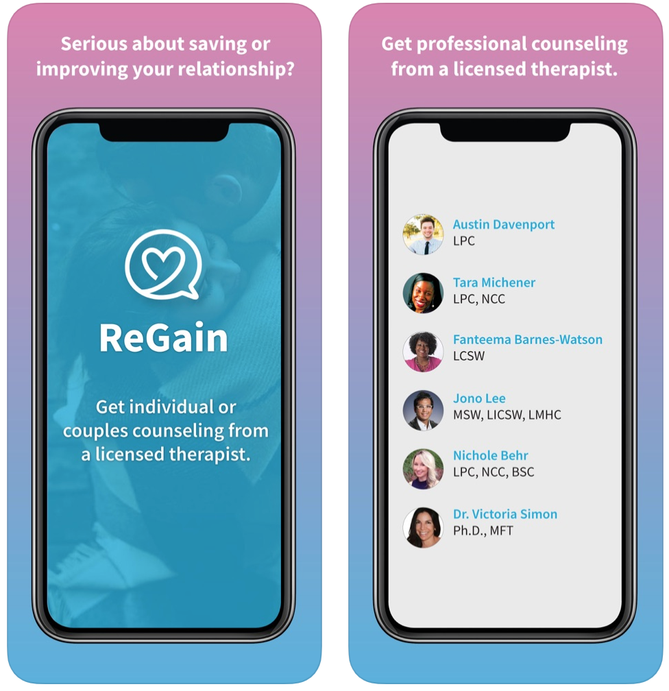 18) ReGain ReGain is specifically for couples therapy, and promises that youll regain intimacy, affection, and other happy feelings for yourself or your relationship. You can sign up as a couple or individually and be connected to a licensed relationship therapist. The app is free for download on iPhone or Android, but sessions range between $40 and $70 per week. Courtesy
