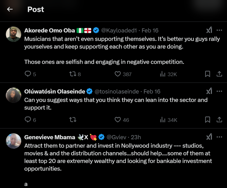 Some users also pointed out that musicians themselves struggle with internal support, making it unfair to expect them to prioritize Nollywood.