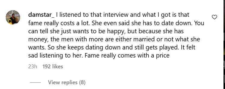 “I listened to that interview, and what I got is that fame really costs a lot. She even said she has to date down. You can tell she just wants to be happy, but because she has money, the men with more are either married or not what she wants. So she keeps dating down and still gets played. It felt sad listening to her. Fame really comes with a price.”