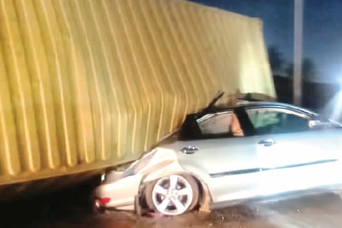 The incident occurred around 6:35 p.m. when a Mack trailer, transporting two 20-foot containers, lost control, causing one of the containers to fall onto the rear side of the moving Lexus Jeep 350 with registration number EKY 251 HW.