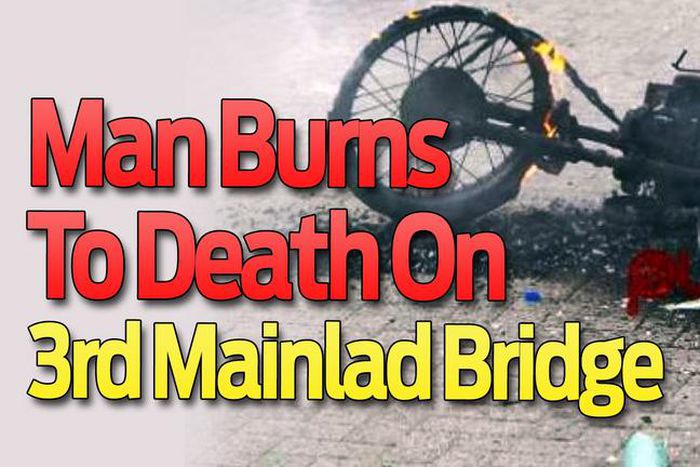 Eyewitnesses say the ugly incident happened at about 6am at the UNILAG water front axis from Iyana-Oworo, heading to the Island during the usual early morning traffic rush which saw the hapless man fall off his bike on the bridge and before any help could get to him, he was engulfed in a fire that burnt him to ashes.