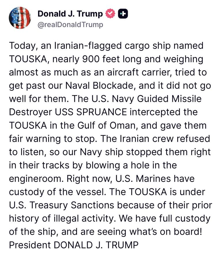 In a post on his Truth Social account, President Donald J Trump shared that the American Navy intercepted an Iranian-flagged cargo ship at the Gulf of Oman. According to Trump, the cargo ship, which is nearly 900 feet long and weighs the size of an aircraft carrier tried to get past the US Navy ship USS SPRUANCE who gave the ship a "fair warning to stop".