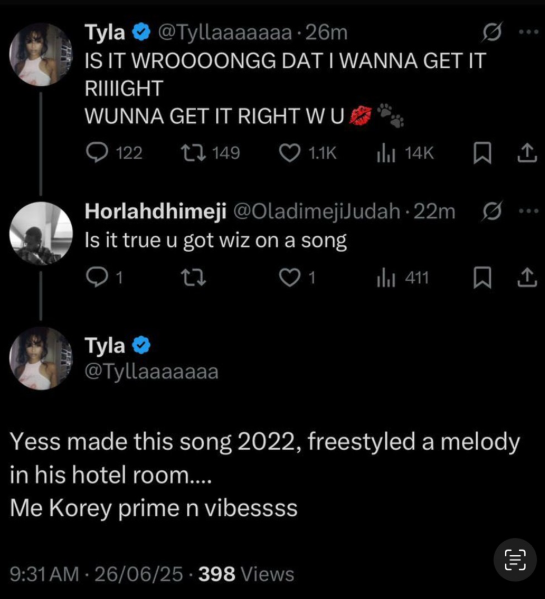 Grammy-winning singer Tyla has confirmed that she has recorded a song with Nigerian megastar Wizkid.