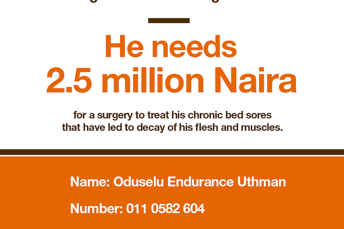 Somewhere in Abuja, on the 1 of October, 2014, a man is driving his wife and two daughters. And it should be a good day, until something goes terribly wrong, and the car is somersaulting multiple times. Incredibly, wife and daughters survive without serious injuries. But the man bears the burden of them all, with a damaged spine and collapsed lungs. That man is Abdullah Okirigi.