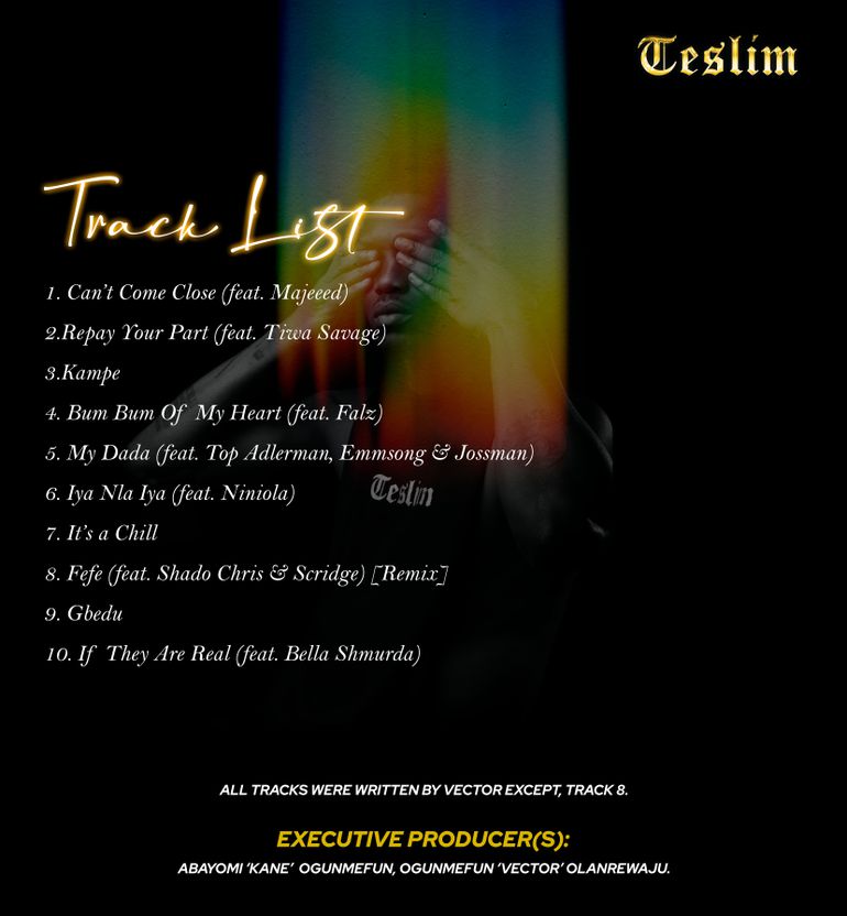 Featuring collaborations with Nigerian music heavyweights like Tiwa Savage, Niniola, and Bella Shmurda, 'Teslim: A Lover Boy PTSD' delivers a blend of smooth lyricism over earworming beats. Songs like Repay Your Heart and Bum Bum Of My Heart showcase Vector’s unique ability to marry vulnerability with melodies, creating a relatable romantic story.