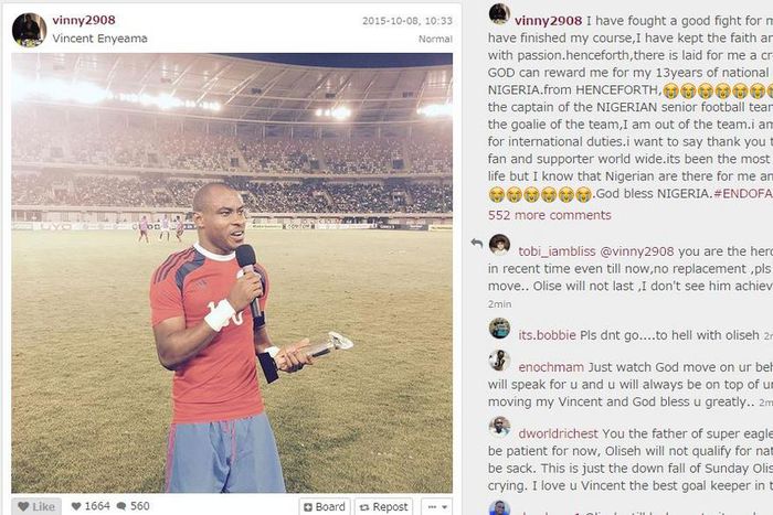 After 13 years with the national team, Enyeama called time on his involvement with the Super Eagles.