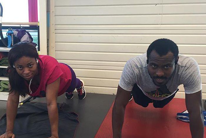 In his latest Instagram post, Enyeama shares a photo of himself and his wife, Promise engaging in light exercise.