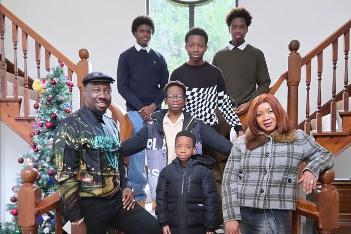 The photo contains Obi Cubana himself, his wife, Ebele Iyiegbu, their sons and extended family all wearing lovely Christmas outfits.