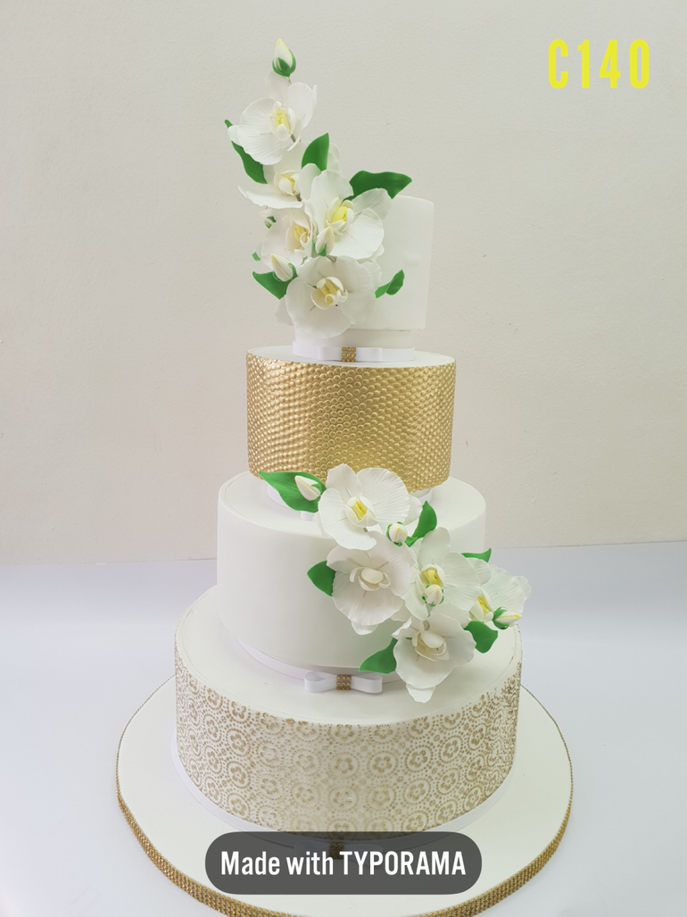 The Attractive Orchids Cake is a beautiful four-layer wedding cake that adds elegance to your big day. Two layers have a shiny gold finish for luxury, while the other two are decorated with delicate orchid flowers, symbolising love and beauty. It’s pretty and rich, and your guests will love it. It is your best bet if you want a stunning wedding cake that tastes delicious.