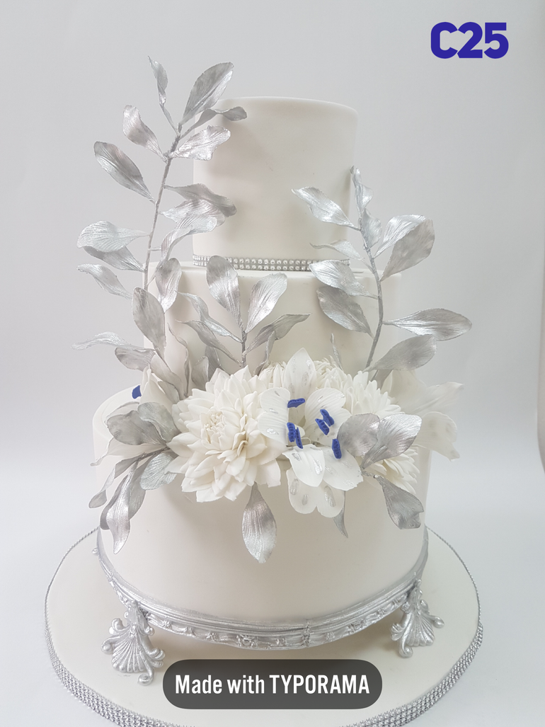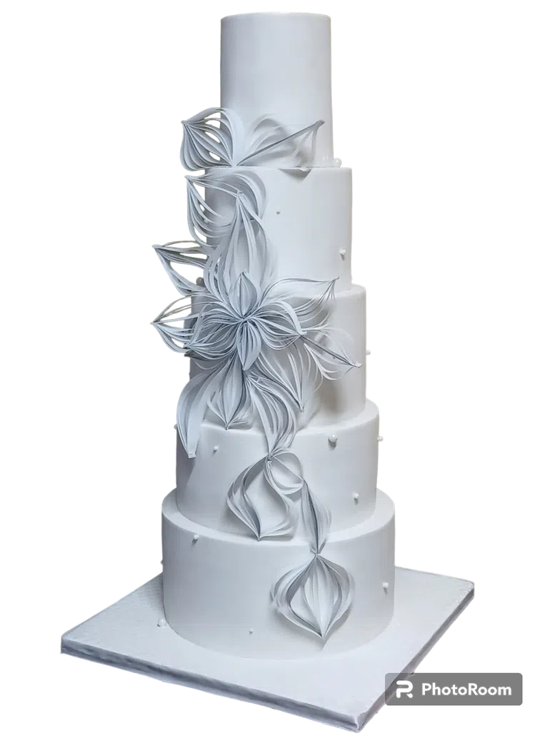 The Pearly White Flower Cake is a beautiful three-layer wedding cake that adds elegance and romance to your special day. Soft, pearly white flowers flow down each layer, symbolizing love and purity. Not only does it look amazing, but it also has a delicious mix of flavours and textures that make every bite a treat.