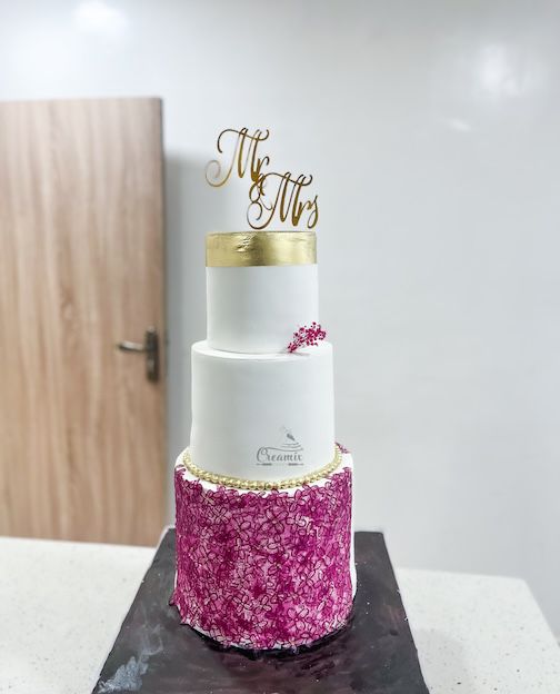 This is an elegant three-tier wedding cake. The bottom tier is covered in a deep pink lace-like pattern, adding a stylish and textured look. The middle and top tiers are plain white, with a small floral decoration. The topmost part has a gold-painted section, matching the “Mr & Mrs” cake topper in a fancy script. The cake sits on a blackboard, making the colours stand out beautifully. It looks classy and perfect for a wedding celebration!