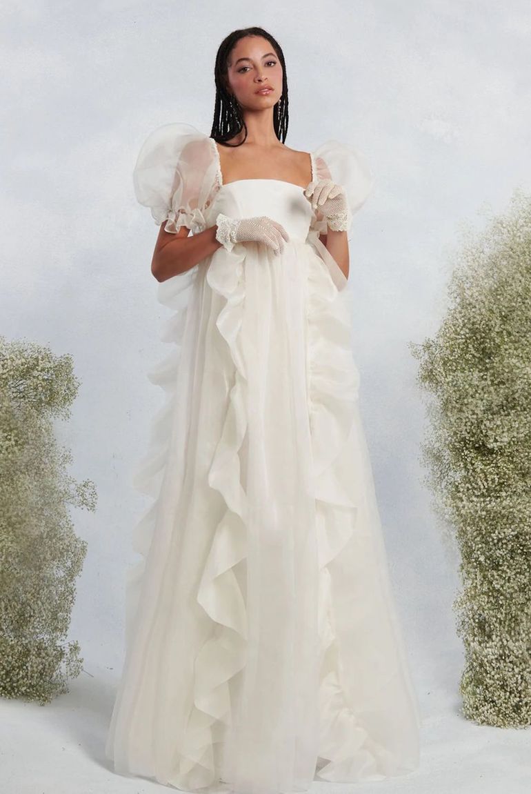 The empire waist gown sits just below the bust and flows down gracefully, often with soft, light fabrics. It’s comfortable, free-spirited, and oh-so-flattering.