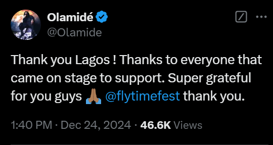 Grammy nominated rapper Olamide made a comeback to the big stage of the famous Eko Hotel with a headline appearance at the 2024 Flytime Fest which is one of Nigeria's most popular annual music festivals.