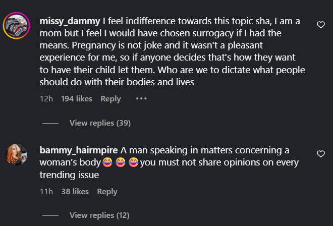 Why do men always have opinions on women bodies? You are not a woman, you don’t have a uterus, you don’t even experience menstrual cramps and co, you don’t go through hormonal changes monthly but you feel you can have opinions on women bodies, if a woman says she doesn’t want to go through pregnancy to birth her children and chooses to use a surrogate it should be respected. As long as it is legally done with consent.