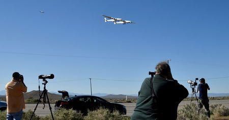 The white airplane called Roc, nicknamed after a giant mythical bird, has a wingspan the length of an American football field and is powered by six engines on a twin fuselage, took to the air shortly before 7 a.m. Pacific time (1400 GMT).