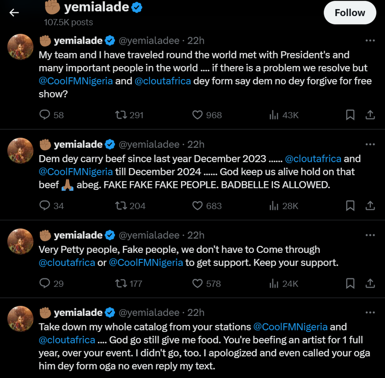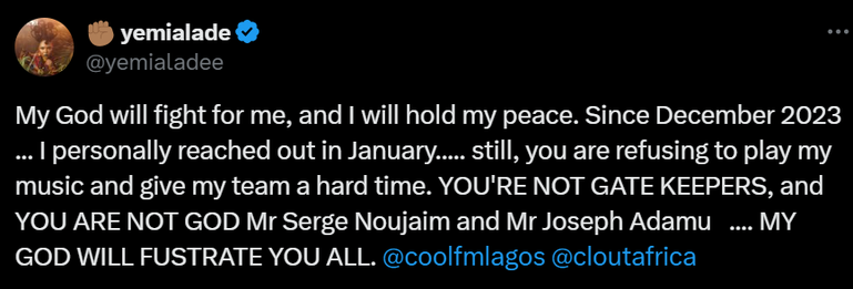 "Take down my whole catalog from your stations @CoolFMNigeria and @cloutafrica .... God go still give me food. You're beefing an artist for 1 full year, over your event. I didn't go, too. I apologized and even called your oga him dey form oga no even reply my text."