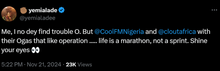 "Me, I no dey find trouble O. But @CoolFMNigeria and @cloutafrica with their Ogas that like operation ..... life is a marathon, not a sprint. Shine your eyes".