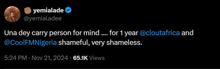 "Una dey carry person for mind .... for 1 year @cloutafrica and @CoolFMNigeria shameful, very shameless."