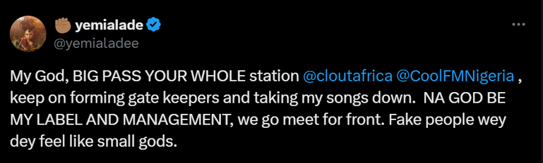 "My God, BIG PASS YOUR WHOLE station @cloutafrica @CoolFMNigeria , keep on forming gate keepers and taking my songs down. NA GOD BE MY LABEL AND MANAGEMENT, we go meet for front. Fake people wey dey feel like small gods," the post reads.